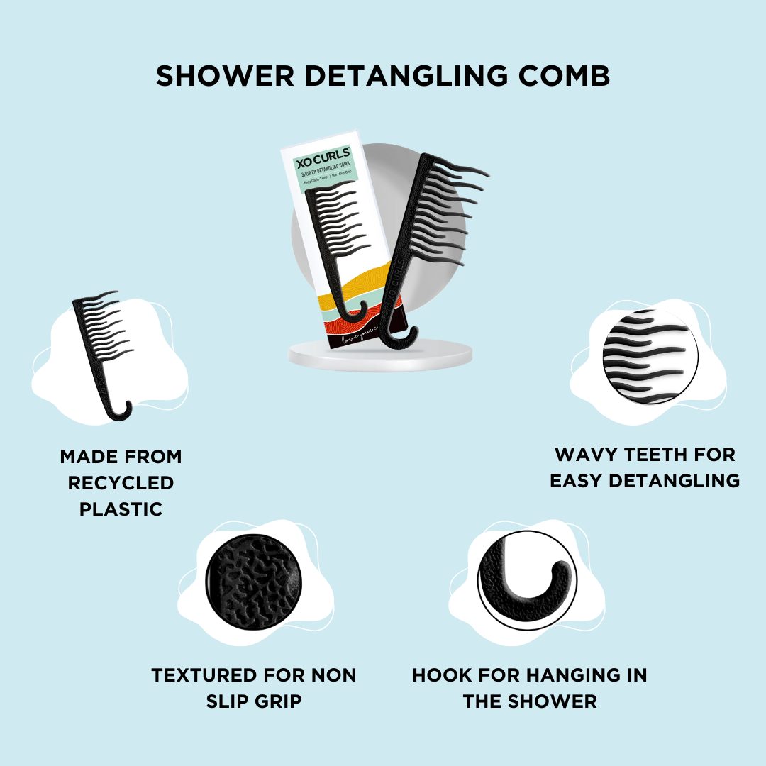 The XO Curls Shower Detangling Comb is designed to gently remove knots and tangles, featuring wave-shaped teeth that glide through hair with minimal breakage. Suitable for wavy hair, the comb comes in various colors and includes a convenient hook for easy bathroom storage. Works Best On Thick Hair Wavy Hair Long Hair